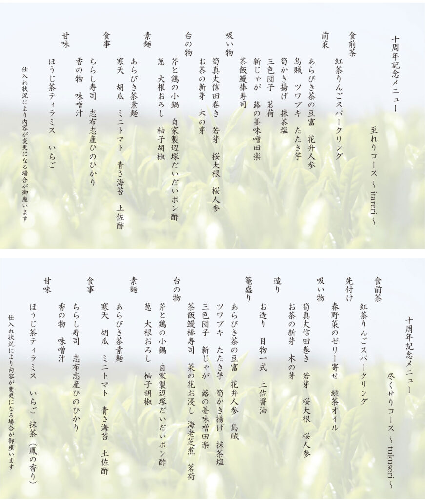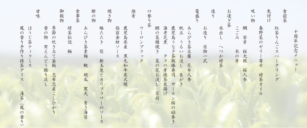 ただいま、お茶の創作レストラン「茶音の蔵」では、10年に渡る皆様のご愛顧へ感謝を込めた「10周年記念メニュー」を提供しております。この度もぜひ皆さまに、春の旬菜とお茶をふんだんに使ったお料理を存分に体感して頂きたく思います。